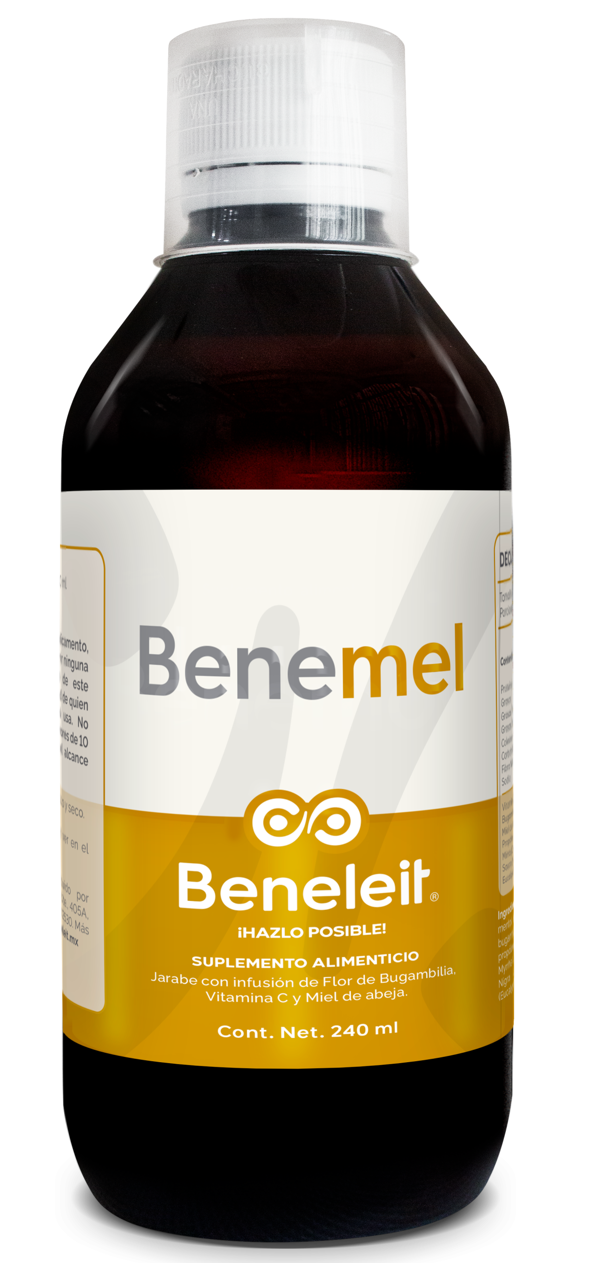 Vitamina C (Ácido ascórbico), mentol, ácido cítrico, extracto líquido de flor de bugambilia (Bougainvillea glabra), miel de abeja, propóleo, extracto líquido de mirra (Commiphora myrrha L.), extracto líquido de saúco (Sambucus nigra L.), extracto líquido de eucalipto (Eucalyptus globulus), propilparabeno y agua.